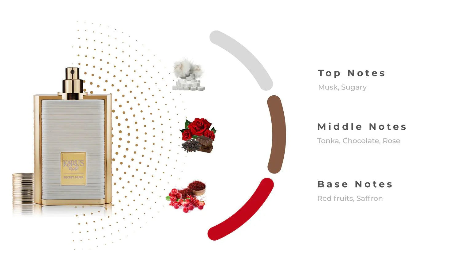 Crafted Elegance: Encased in an exquisitely designed bottle; KARUS SECRET MUSK embodies the elegance and craftsmanship synonymous with Khadlaj Perfumes. The sleek packaging reflects the mystery and allure that this fragrance encapsulates; inviting you to discover the secret within.